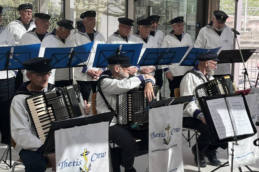 Am Nachmittag füllte sich das Café Dorfplatz bis auf den letzten Platz. Zahlreiche Bewohner und externe Gäste kamen, um den maritimen Klängen zu lauschen. Der Seemannschor präsentierte ein abwechslungsreiches Programm mit stimmungsvollen Seemannsliedern, welches das Publikum begeisterte.